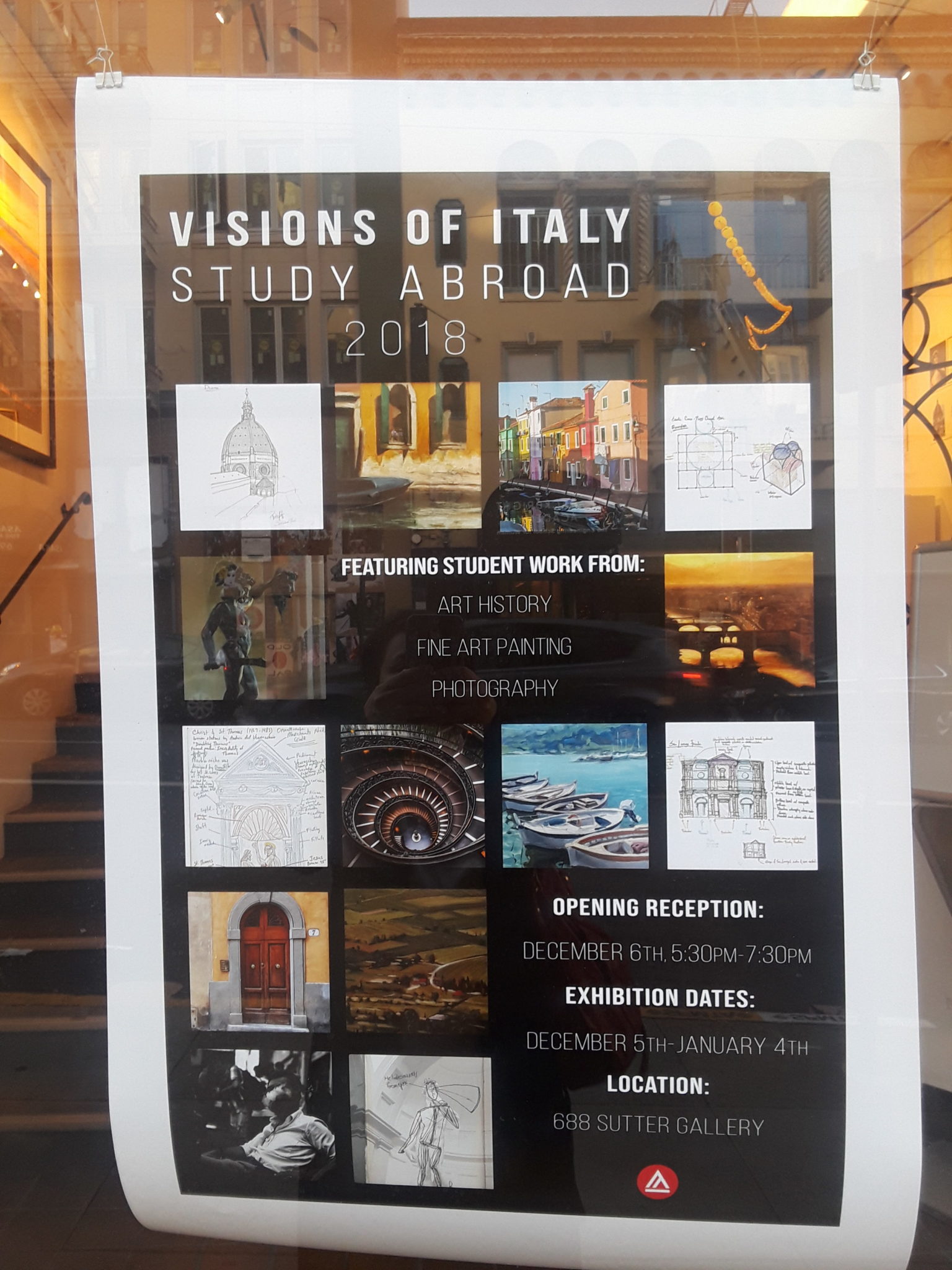 The Visions of Italy Exhibit runs until January 4, 2019. Drop by 688 Sutter to see and be inspired by the accomplishments of the Study Abroad 2018 batch for yourself.